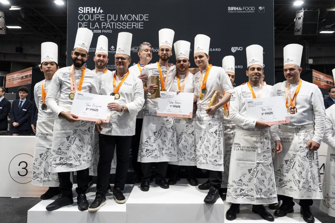 Le 19 janvier dernier, pendant Sirha Bake & Snack, la victoire de la France, représentée par Yoan Palamara (candidat chocolat), Abel Nesson (candidat sucre) et Axel Lebellanger (candidat glace), et coachée par Franck Michel, est venu clôturer deux journées de la sélection Europe de la Coupe du Monde de la Pâtisserie, la compétition de référence de la pâtisserie mondiale. La Belgique se hisse à la 2ème place et l’Italie complète le podium. Les 3 équipes, tout comme les Pays-Bas (4ème) et le Royaume-Uni (5ème), sont dès à présent qualifiés pour la Grande Finale de la Coupe du Monde de la Pâtisserie, qui se tiendra pendant Sirha Lyon, en janvier 2027. Une nouvelle fois, la France confirme son excellence en matière de pâtisserie en réalisant un doublé sur cette sélection continentale, après sa victoire en 2024. Cette performance atteste de l’excellence française en matière de pâtisserie, et positionne une nouvelle fois la France comme la référence en matière de pâtisserie sur le continent européen. Durant les 5h30 d’épreuve, les 8 équipes de 8 pays d’Europe différents ont réalisé 10 tartes Tatin individuelles revisitées avec un accompagnement, 12 desserts à l’assiette glacés individuels, 12 créations sucrées à base de chocolat, 3 pièces artistiques (une en chocolat, une en sucre et une en glace hydrique), ainsi qu’un buffet regroupant l’ensemble de ces créations. Dans la continuité de ce qui a été initié lors de la Grande Finale 2025, l’épreuve autour du chocolat a été repensée pour s’inscrire davantage dans l’univers de la street-food. Les candidats ont dû réaliser 12 créations sucrées de type finger food qu’ils ont finalisé sous les yeux des membres du jury, avec une scénographie spécifique à chaque équipe. Lors de cette édition, les candidats glace ont fait leur grand retour sur les sélections continentales. Une évolution du règlement qui leur a permis de créer une véritable cohésion d’équipe et de démontrer leur maîtrise technique aux membres du jury dès les sélections continentales. « Durant ces deux jours, nous avons eu un excellent niveau de compétition. Les dégustations ont été marquées par des goûts originaux et un véritable savoir-faire technique, on a pu constater que les équipes se sont vraiment bien préparées. Les pièces artistiques en sucre, chocolat et glace qui ont été réalisées sont magnifiques, les candidats ont effectué un travail phénoménal. Cette sélection Europe a été particulièrement impressionnante ! », explique Pierre Hermé, Président du concours. Après l’Europe, l’année 2026 sera rythmée par les autres sélections continentales : Americas, Africa, Moyen-Orient et Asie. Les 20 équipes sélectionnées lors de ses qualifications se retrouveront ensuite pour la Grande Finale de la Coupe du Monde de la Pâtisserie.