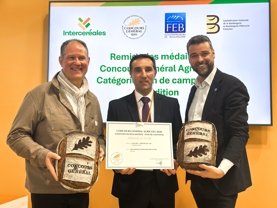 Le site de production breton Aug’Unit a obtenu la Médaille d’Or au Concours Général Agricole 2026, dans la catégorie Pain de campagne Industriel. Cette distinction a été officiellement remise le 23 février dernier, lors du Salon International de l’Agriculture, sur le stand Intercéréales. Le 10 février 2026, en amont du Salon International de l’Agriculture, la Rungis Académie à Paris a accueilli la première édition officielle du concours du pain de campagne. L’édition 2025 avait été organisée à titre expérimental afin d’ajuster les critères de dégustation et d’évaluer les contraintes techniques liées à la fabrication sur place. Cette nouvelle catégorie marque une étape importante dans l’évolution du Concours Général Agricole. Pour la première fois, l’organisation a dû encadrer la production d’un produit ne pouvant souffrir d’aucun délai avant dégustation : les pains ont été préparés et cuits sur site, au sein du centre de formation d’apprentis de la Rungis Académie, puis immédiatement évalués par le jury. Deux catégories étaient représentées : sept candidats en boulangerie artisanale et huit enseignes en boulangerie industrielle, sélectionnées en région par la Confédération nationale de la boulangerie-pâtisserie française (CNBPF) et la Fédération des Entreprises de Boulangerie (FEB). Un cahier des charges précis, élaboré avec l’appui de l’Institut national de l’origine et de la qualité (INAO), a encadré l’évaluation des produits. Le jury d’experts a notamment salué « un aspect visuel très agréable avec une belle grigne », « une belle cuisson du pain » ainsi qu’un « goût très intéressant », concluant à un « produit correspondant aux attendus ». Ces appréciations viennent récompenser le travail de rigueur et de régularité mené par les équipes d’Aug’Unit. Présent au Salon International de l’Agriculture pour recevoir la distinction, Boris Calle, Président-Fondateur d’Aug’Unit, déclare : « Cette Médaille d’Or, obtenue lors de la première édition officielle du concours du pain de campagne, constitue une reconnaissance forte de notre engagement. Elle récompense le travail collectif de nos équipes et démontre que rigueur, exigence qualitative et maîtrise des savoir-faire peuvent aller de pair au service du bon pain français. » Le pain de campagne Médaillé d’Or sera disponible dans les prochaines semaines dans les points de vente des enseignes Augustin, L’Art du Pain et Mariette. Il sera identifié par une pastille officielle “Médaille d’Or–Concours Général Agricole 2026”.