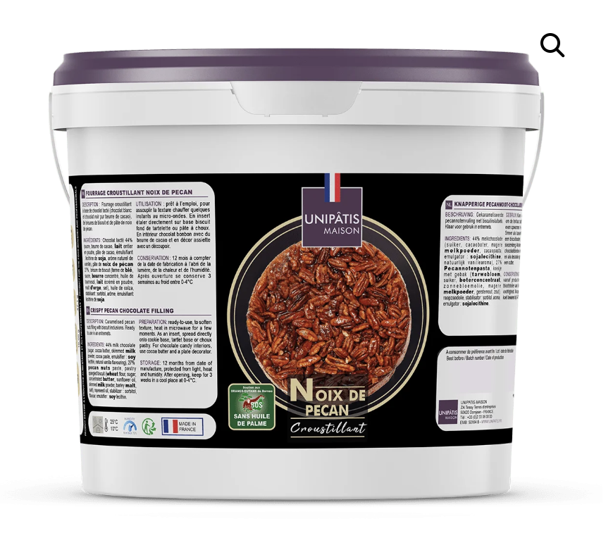 Unipâtis présente ses deux déclinaisons du pécan avec une version parfaite en insert pour apporter texture et caractère, et une version fondante, idéale pour parfumer vos crèmes et préparations avec ses notes rondes et gourmandes. Unipatis torrefie et raffine l’ensemble de ses fruits secs dans son unique site de production en Normandie et communique en toute transparence sur sa sélection de matières premières. Le Fourrage croustillant est réalisé avec une base de chocolat lacté de couverture pur beurre de cacao, de brisures de biscuit et de pâte de noix de pécan, sans huile de palme. Idéal pour insert entremets, tartes, éclairs, glaces et intérieur chocolat bonbon, il est prêt à l’emploi. Cet insert permet de marier les textures des entremets en créant du contraste : la mousse fondante avec le biscuit moelleux et l’insert croustillant. Adapté à la congélation et surgélation, reste bien craquant. Quant au Praliné Caramélisé Pécan 50 %, il est à base de noix de pécan torréfiées (50 %-USA) et caramélisées au sucre cuit, permettant de faire ressortir le goût des arômes de noix de pécan.